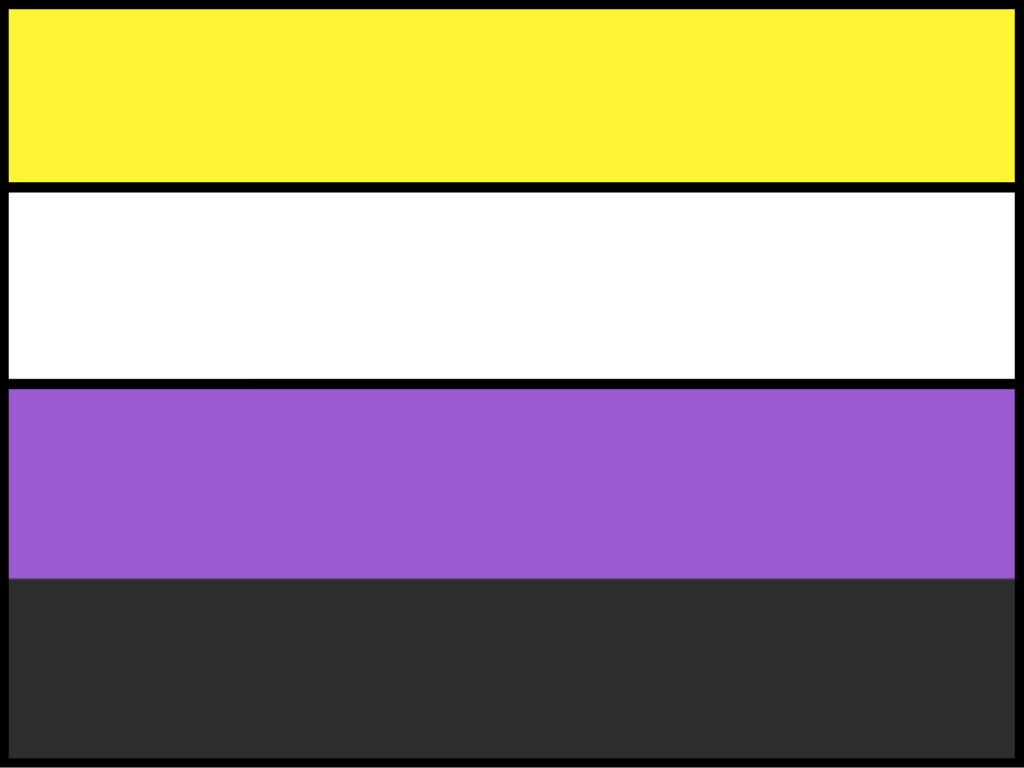 In 2014, Kye Rowan designed the Nonbinary Pride Flag to give visibility to individuals whose gender identity does not conform to the traditional male/female binary. Featuring four distinct colours—yellow, white, purple, and black—each stripe represents a different aspect of nonbinary identity.