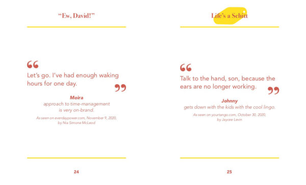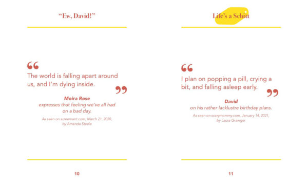 This book contains over 150 of the finest quotes from the most infamous riches-to-rags story a small town has ever seen. From side-splitting bickering between David and Alexis and Roland Schitt’s political wisdom to Johnny Rose’s solid business advice and of course, Moira’s many regaling turns of phrase. Whether you need a pick-me-up or a well-timed put-down, let the eclectic cast of Schitt’s Creek guide you on your way.