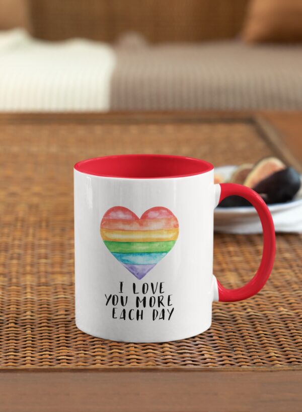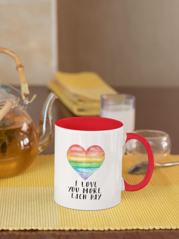 These Valentine’s inspired mugs feature a rainbow heart and the words ” I Love You More Each Day”