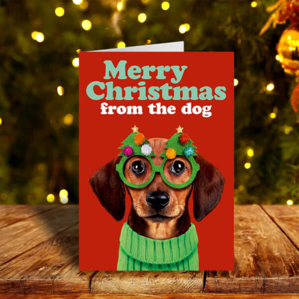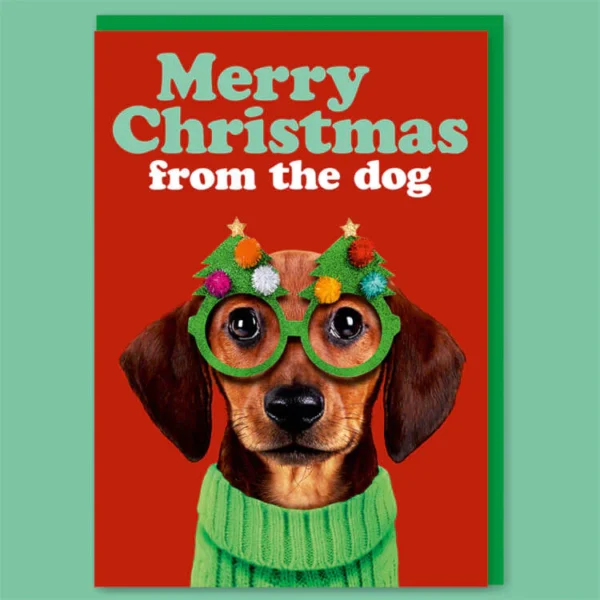 Celebrate the holiday season with a touch of canine charm! Our Christmas card features a colorful image of a clever brown dog in a festive green Christmas jumper, sporting Christmas tree glasses against a vibrant red backdrop. The green and white text above wishes recipients a heartwarming “Merry Christmas from the dog.” Let your furry friend send their own holiday greetings in style!