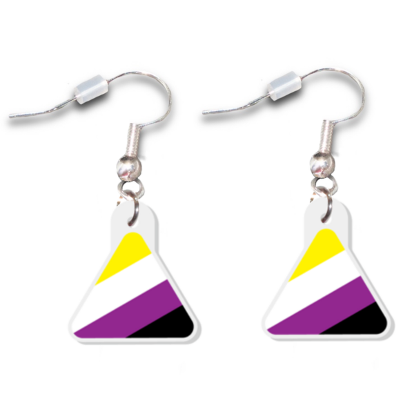Our stunning acrylic non-binary earrings feature a triangle drop pendant featuring the iconic non-binary/enby Pride flag. Finished off with a silver-plate fish hook with rubber stoppers.