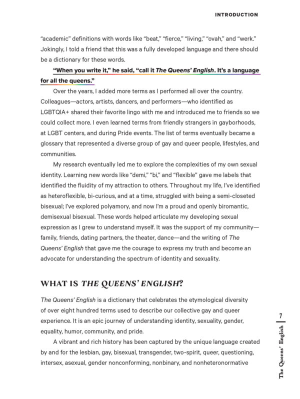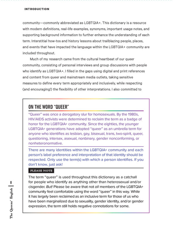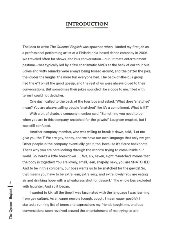 A comprehensive guide to modern gay slang, queer theory terms, and playful colloquialisms that define and celebrate LGBTQIA+ culture. Do you know where “yaaaas queen!” comes from? Do you know the difference between a bear and a wolf? Do you know what all the letters in LGBTQIA+ stand for? A series of educational lessons highlight key people and events that shaped queer language; readers will learn the linguistic importance of pronouns, gender identity, Stonewall, the Harlem Renaissance, and more.