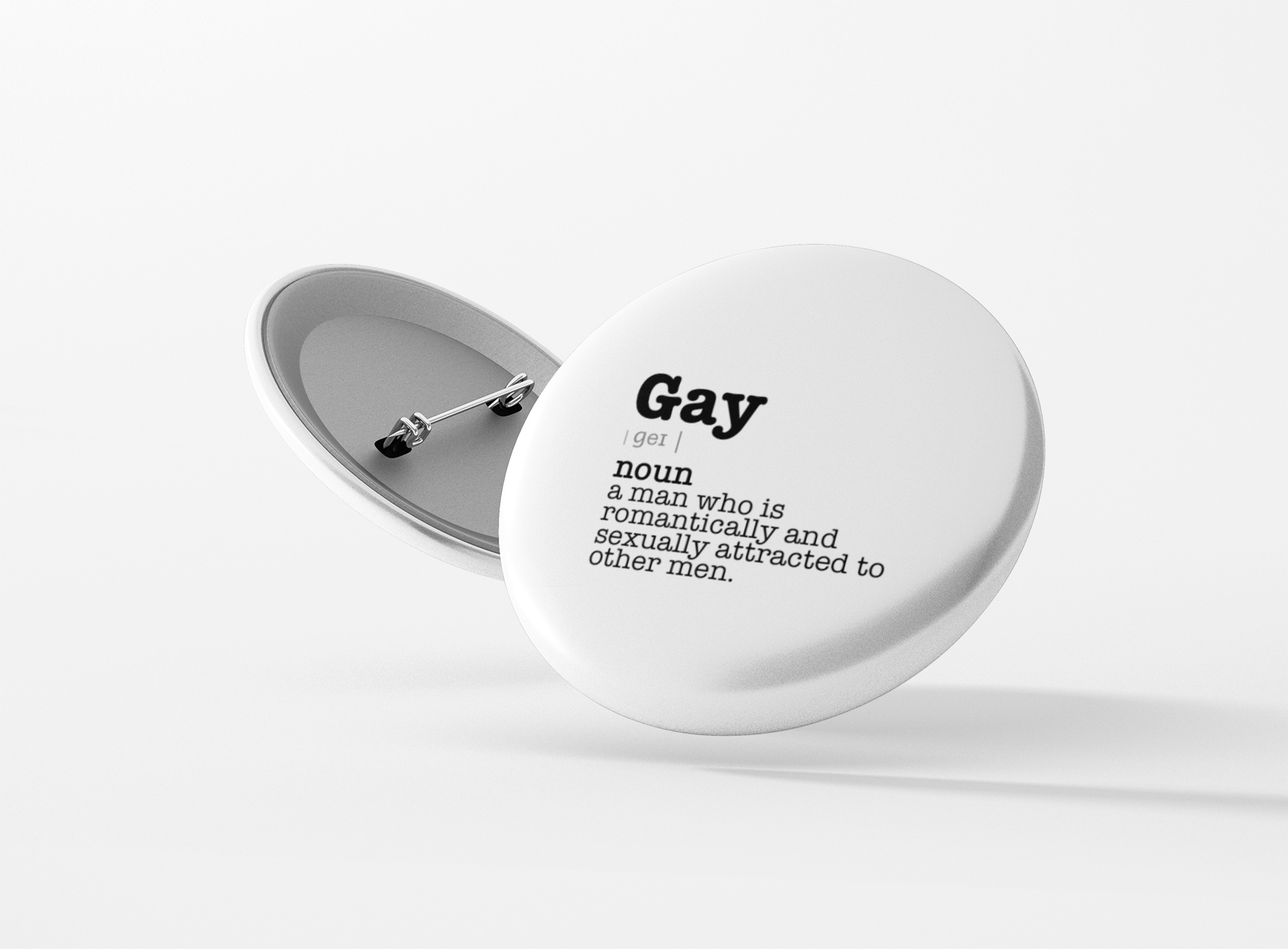 The Gay meaning badge has the following text on it “a man who is romantically and sexually attracted to other men”